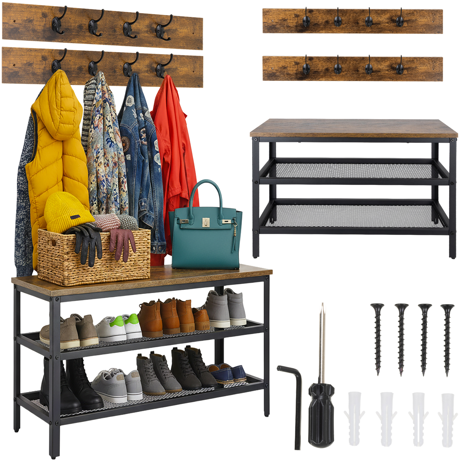 2-i-1 Skohylle med Knaggrekke og Benk