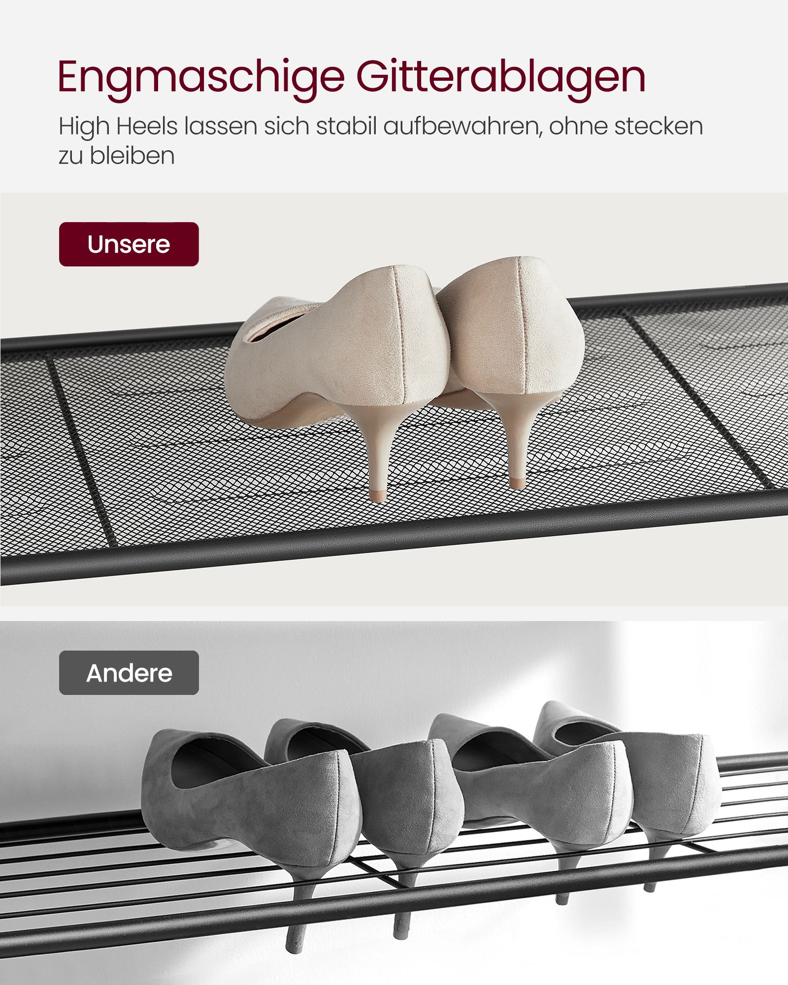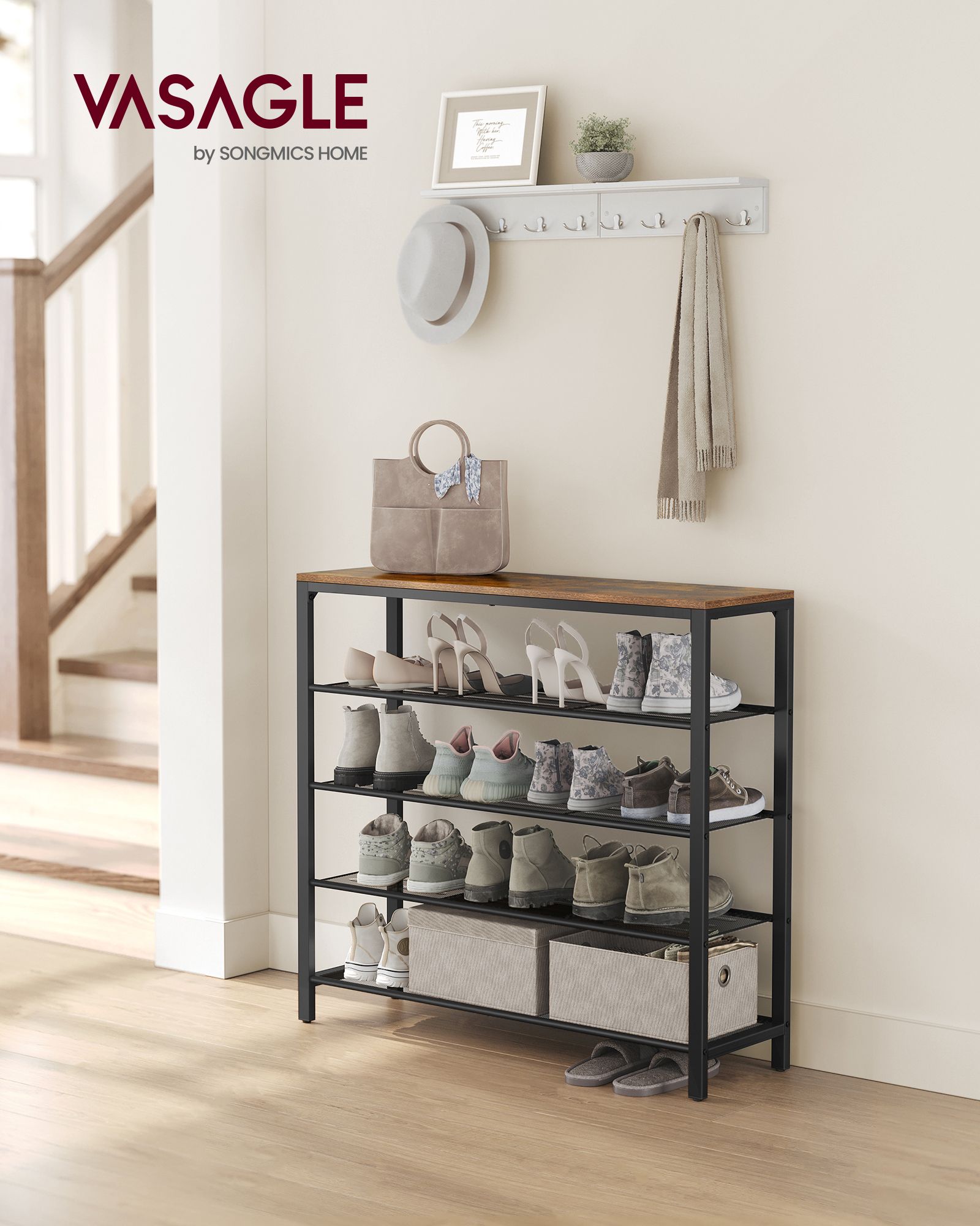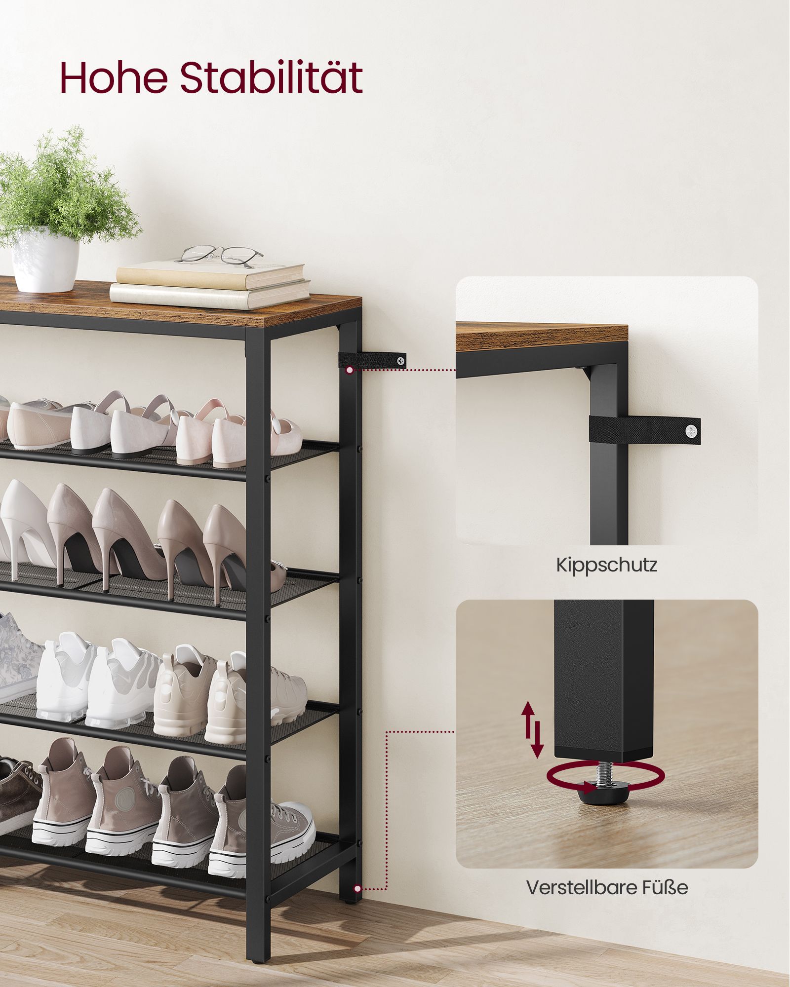 Skostativ med stilig topplate i vintage brun og 4 svarte netthyller i trendy industriell stil