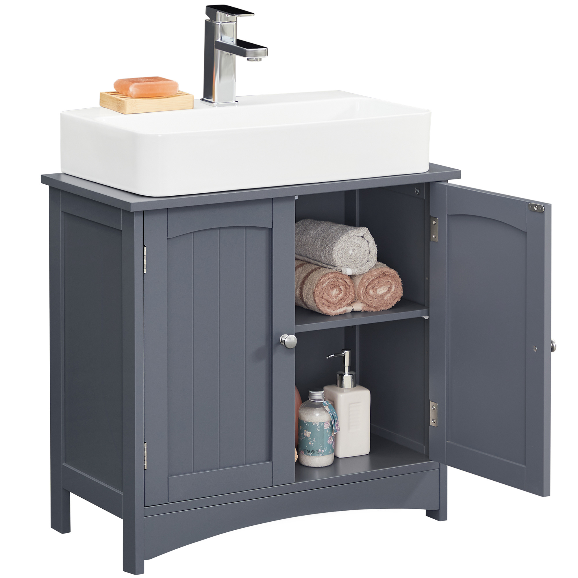 Oppbevarer håndklær, rengjøringsmidler, toalettpapir og andre baderomsartikler beskyttet mot støv, vannsprut og innsyn