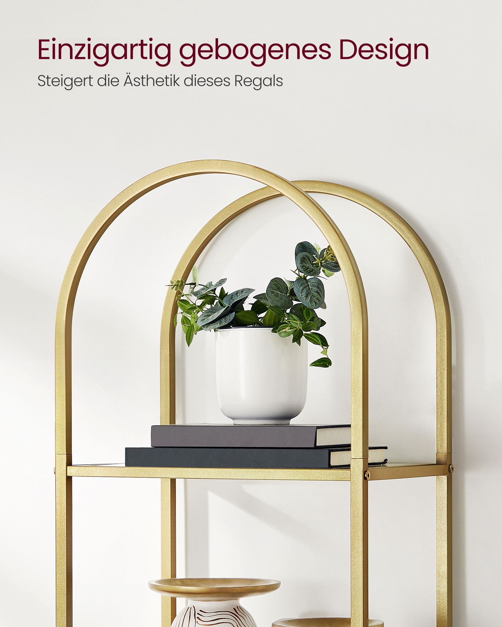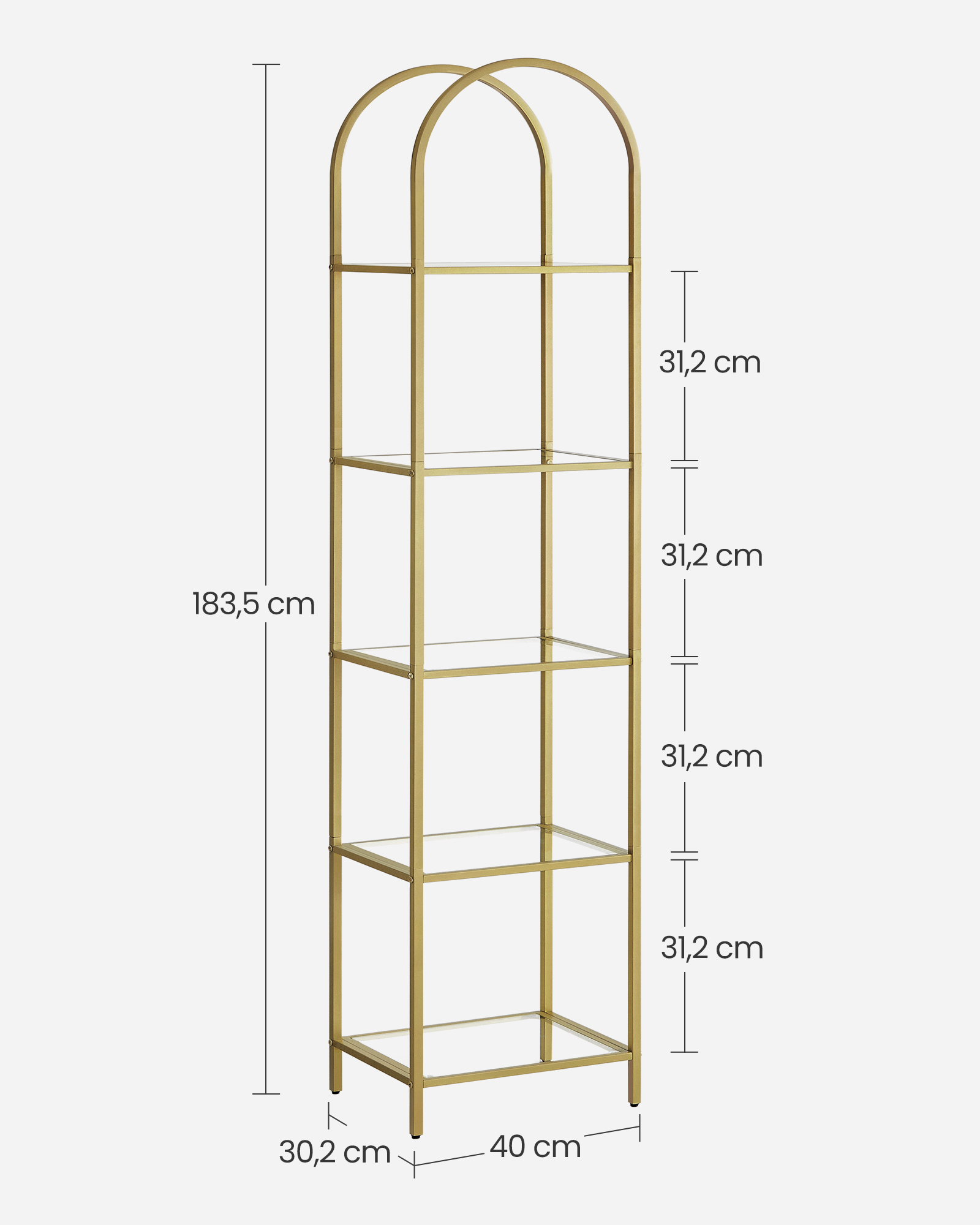 5-etasjes bokhylle i gull med elegant buet topp og glasshyller som fremhever favorittsakene dine