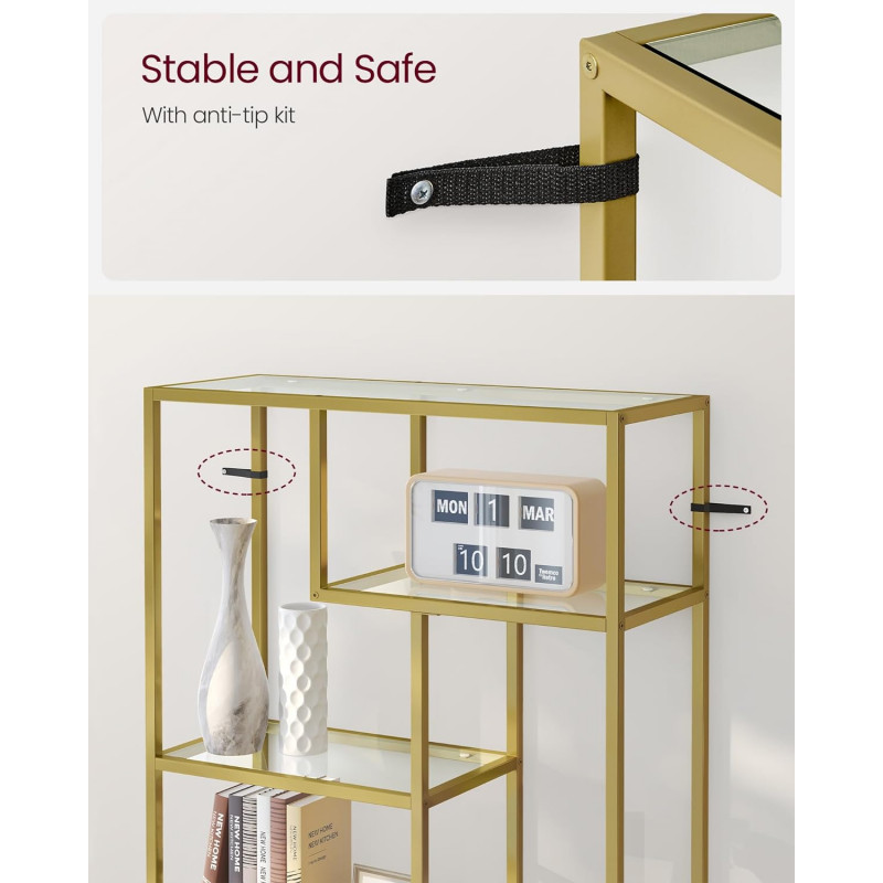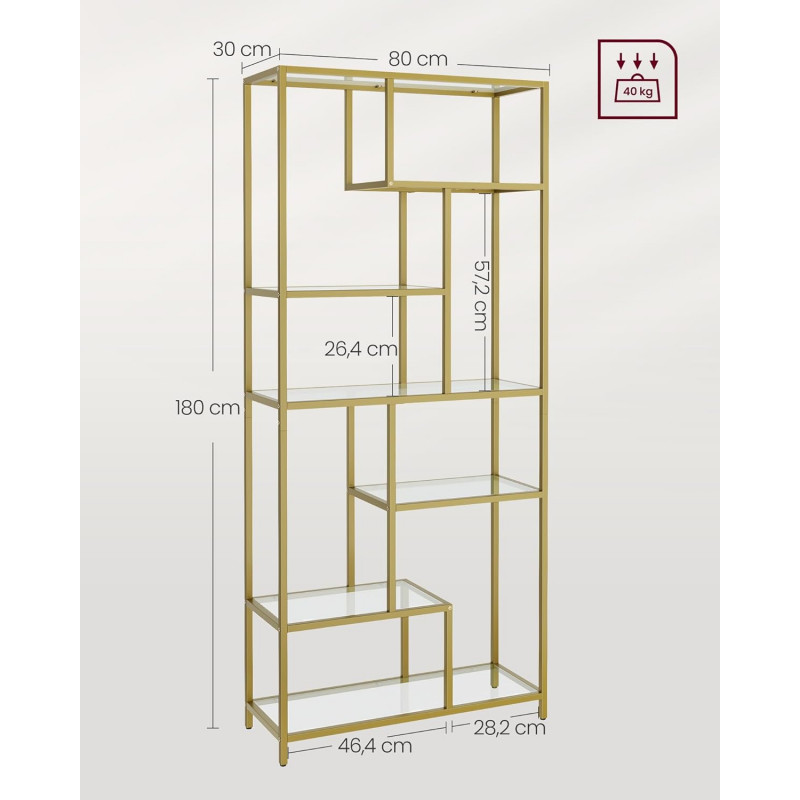 Bokhylle i metallisk gull med glasshyller og inndelte nivåer som gir en luftig og elegant utstilling