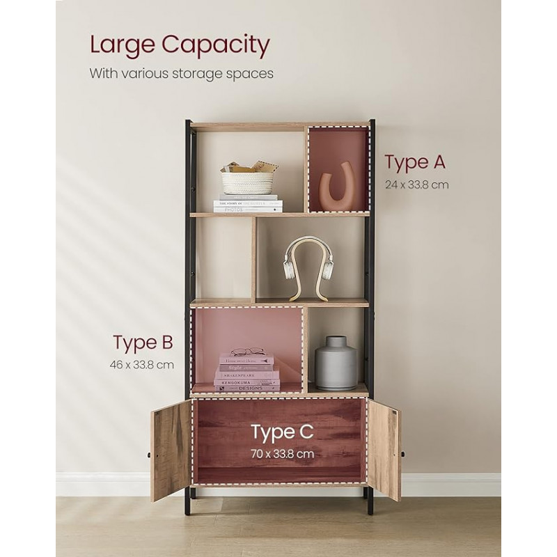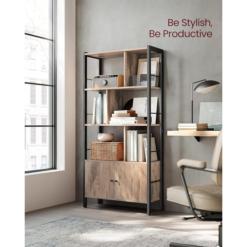 Bokhylle i rustikk lysbrun/svart som kombinerer åpen oppbevaring med et praktisk underskap