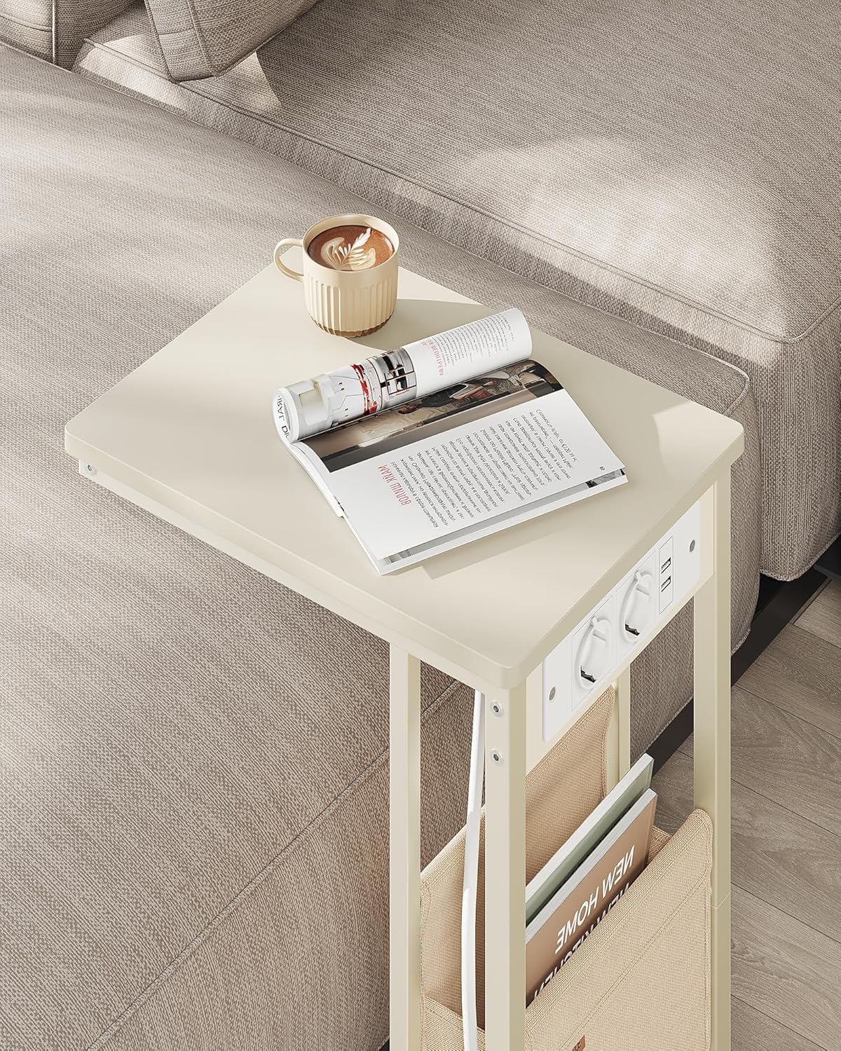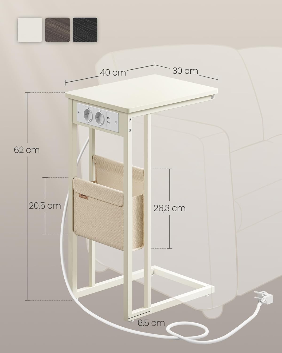 Kompakt C-formet sidebord (30 × 40 × 62 cm) som er perfekt for små rom og lett å skyve inn under sofa eller seng