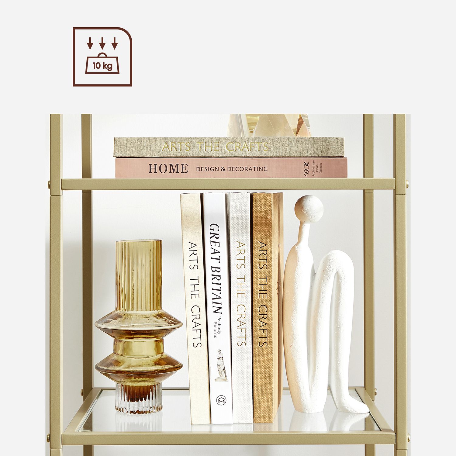 Herdet glass og stålramme gir en elegant, men robust konstruksjon der hver hylle tåler opptil 10 kg