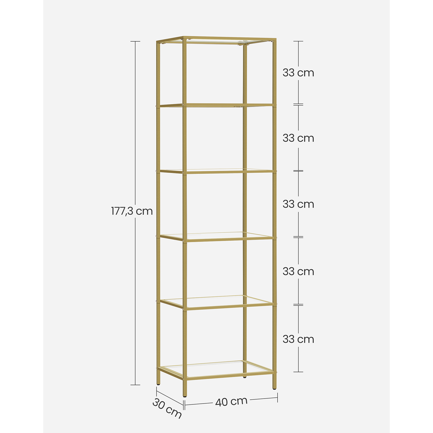 Elegant gullbokhylle med glasshyller – 6 nivåer, 30 × 40 × 177 cm