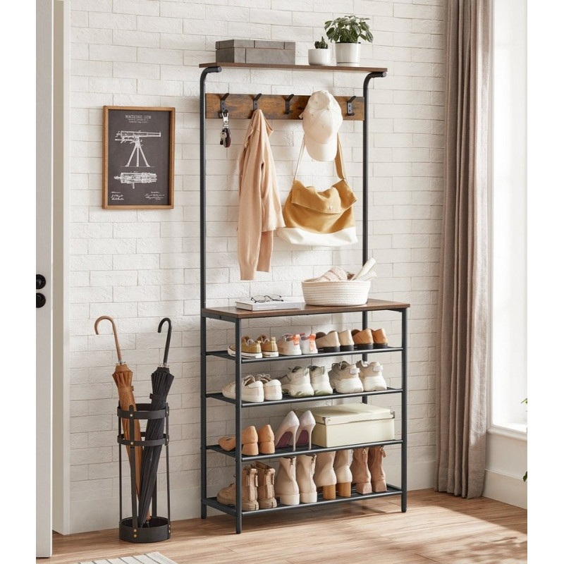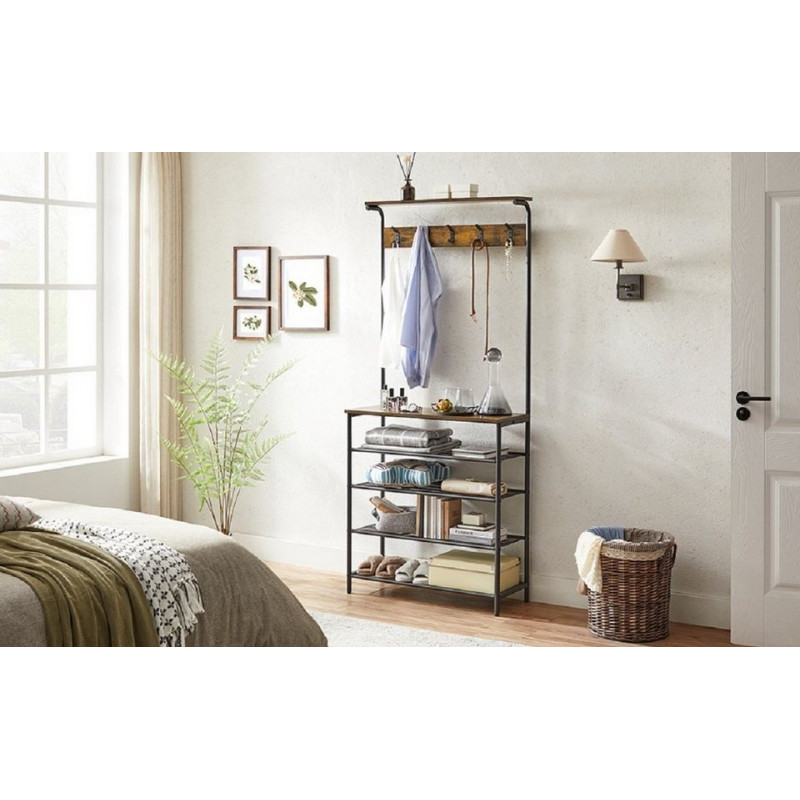 Entréstativ i industriell design med klesstativ og 5-etasjes skohylle