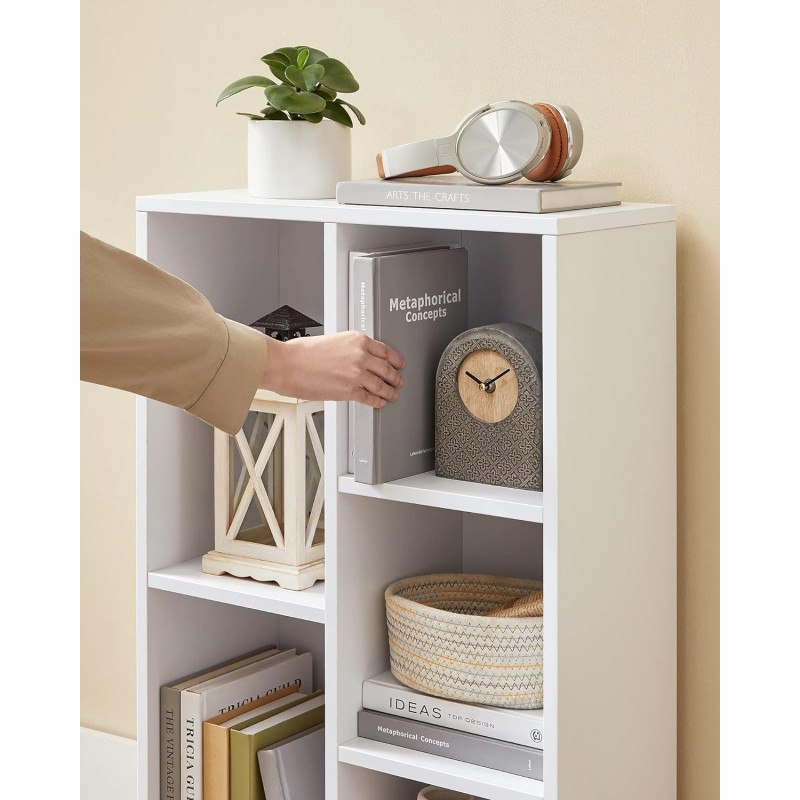 Moderne bokhylle i skyhvit finish som kombinerer stil og oppbevaring uten å kompromisse med interiøret