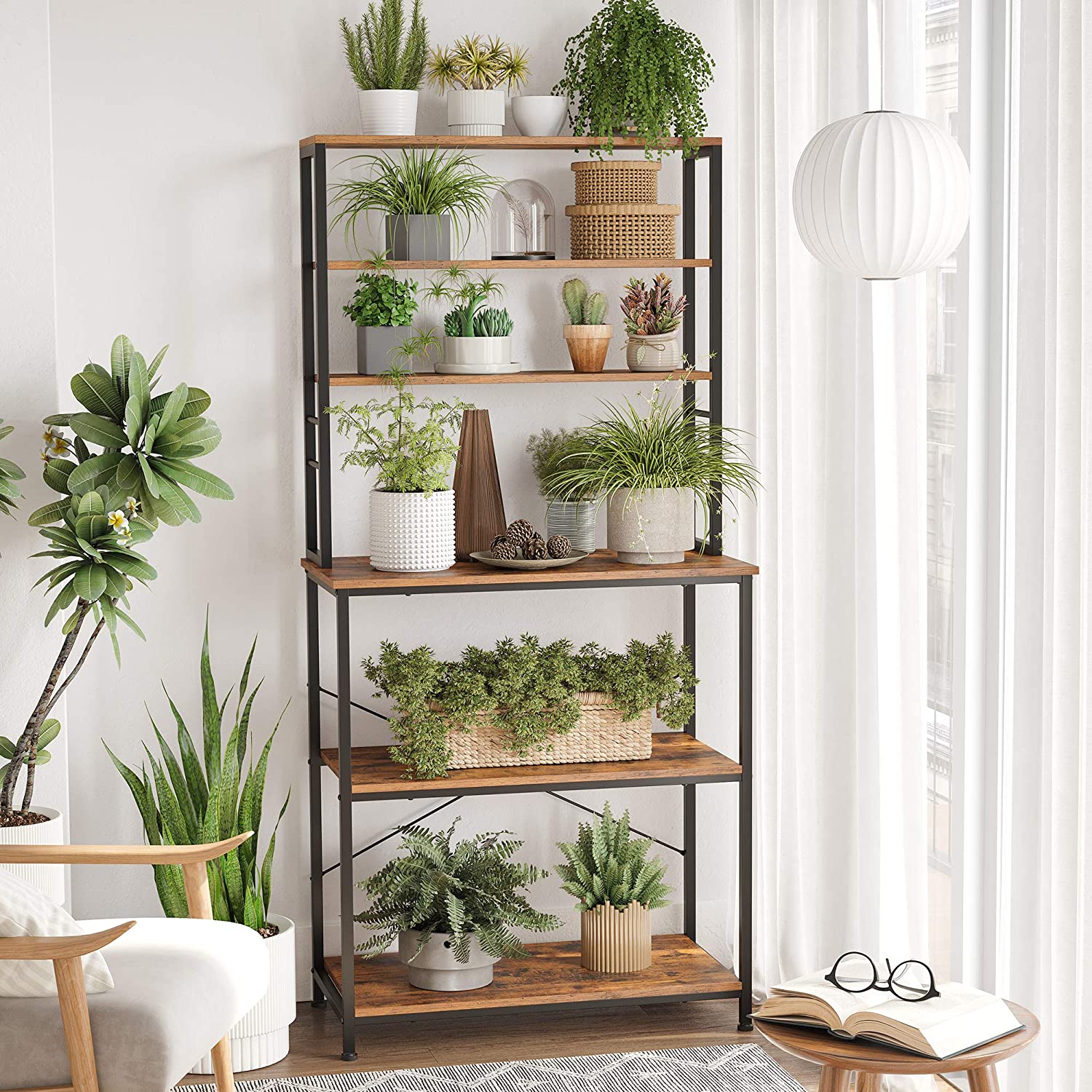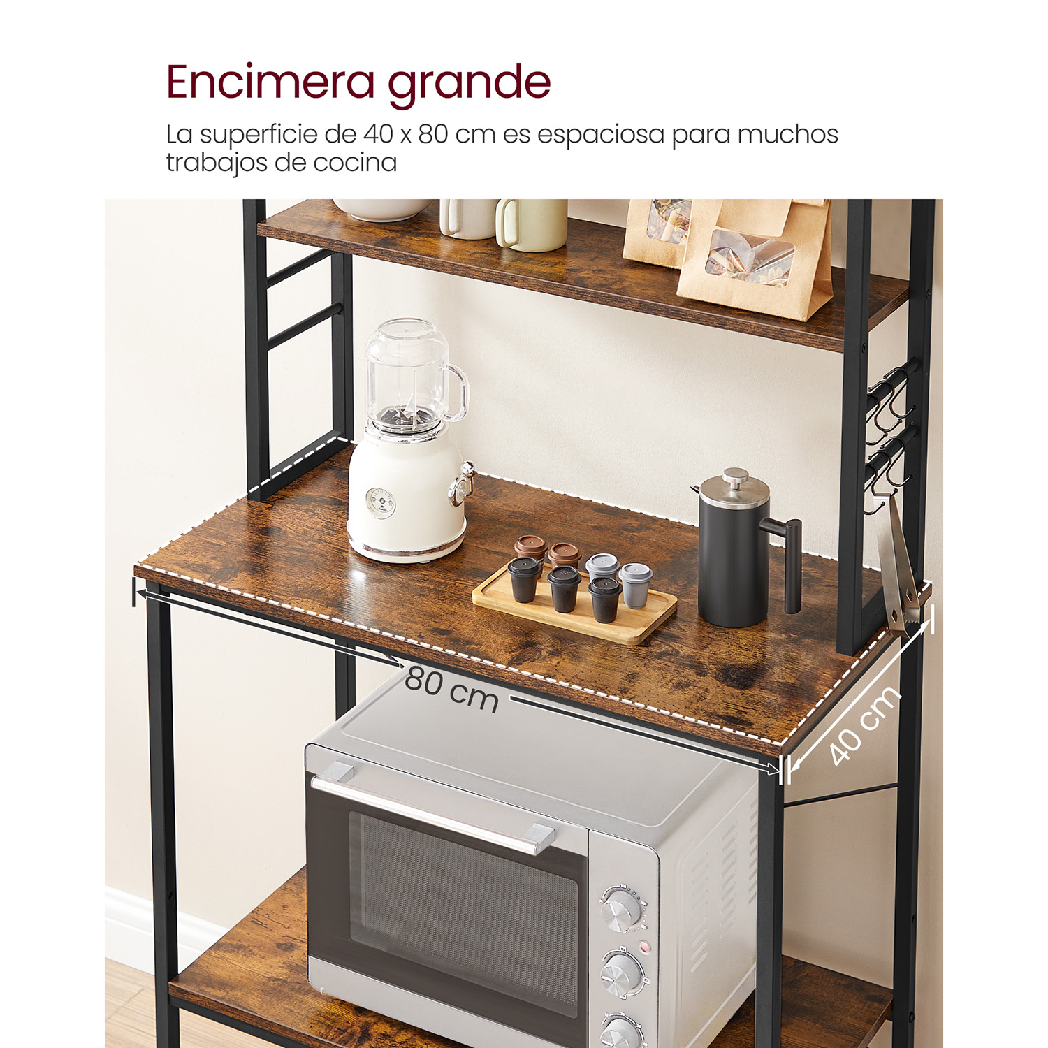 Kjøkkenhylle med benk – 6 kroker og flere hyller, 80 × 40 × 167 cm, vintage brun/svart
