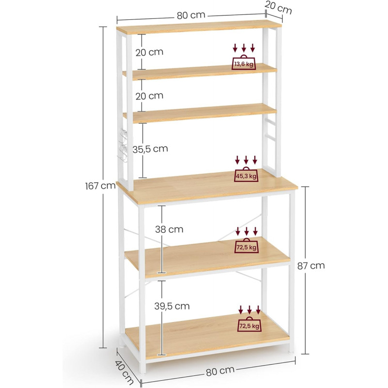 Romslig kjøkkenhylle i eik/hvit design med 6 hyller og 6 kroker som hjelper deg å skape orden på kjøkkenet