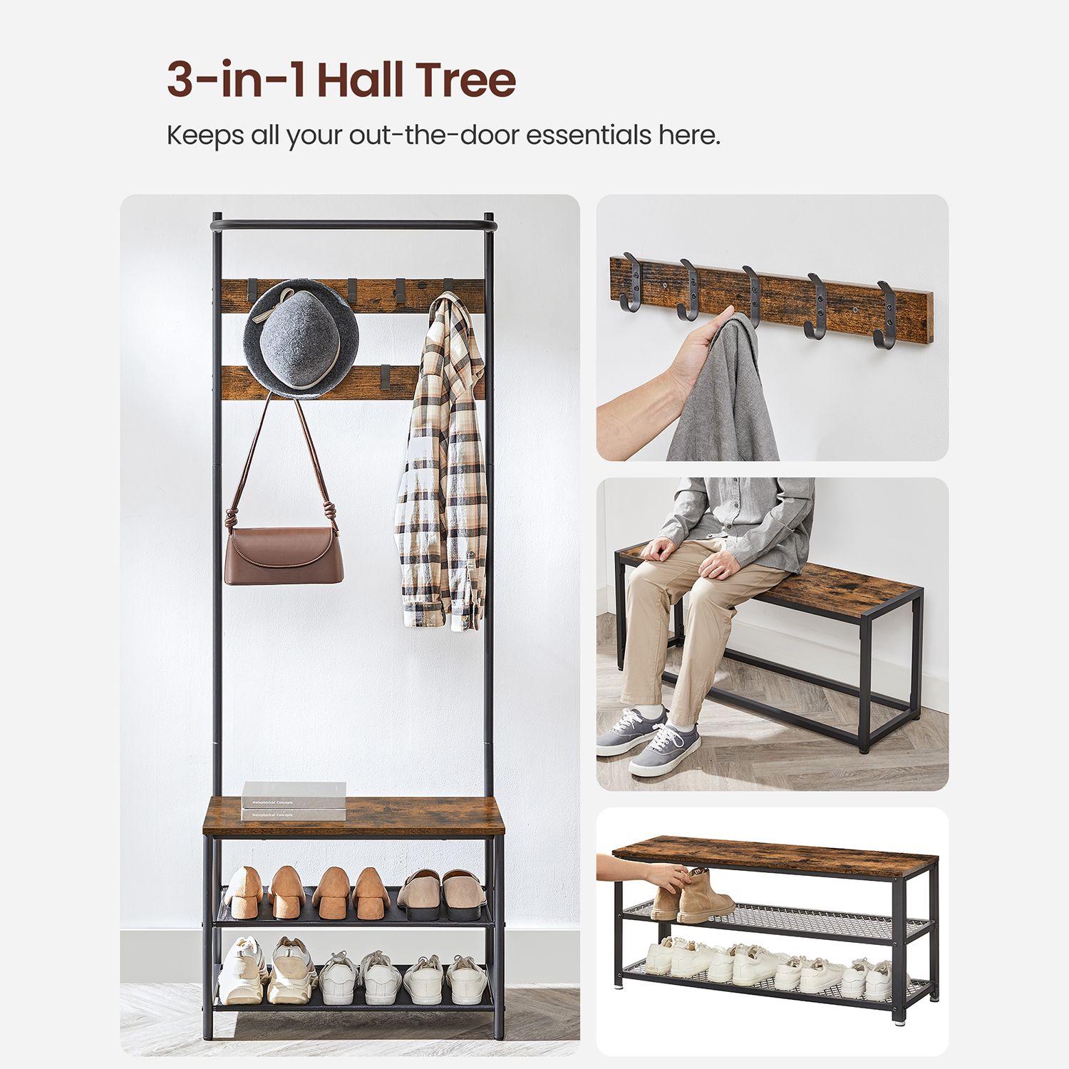 Klesstativ i vintage brun med skoopbevaring – 64 x 32,2 x 180 cm