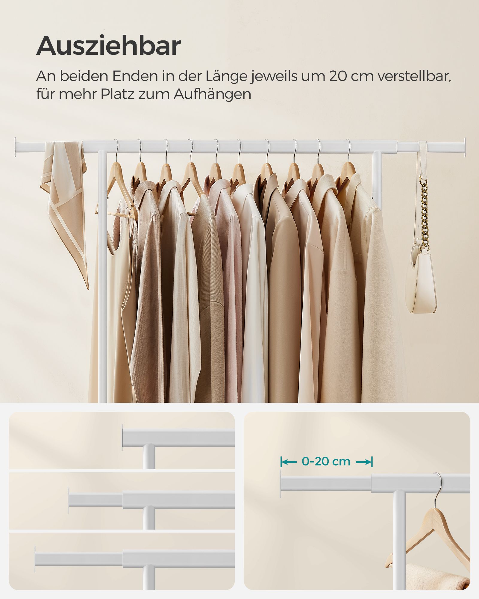 Uttrekkbar og justerbar klesstang som kan tilpasses i lengde mellom 92–132 cm for ekstra hengeplass