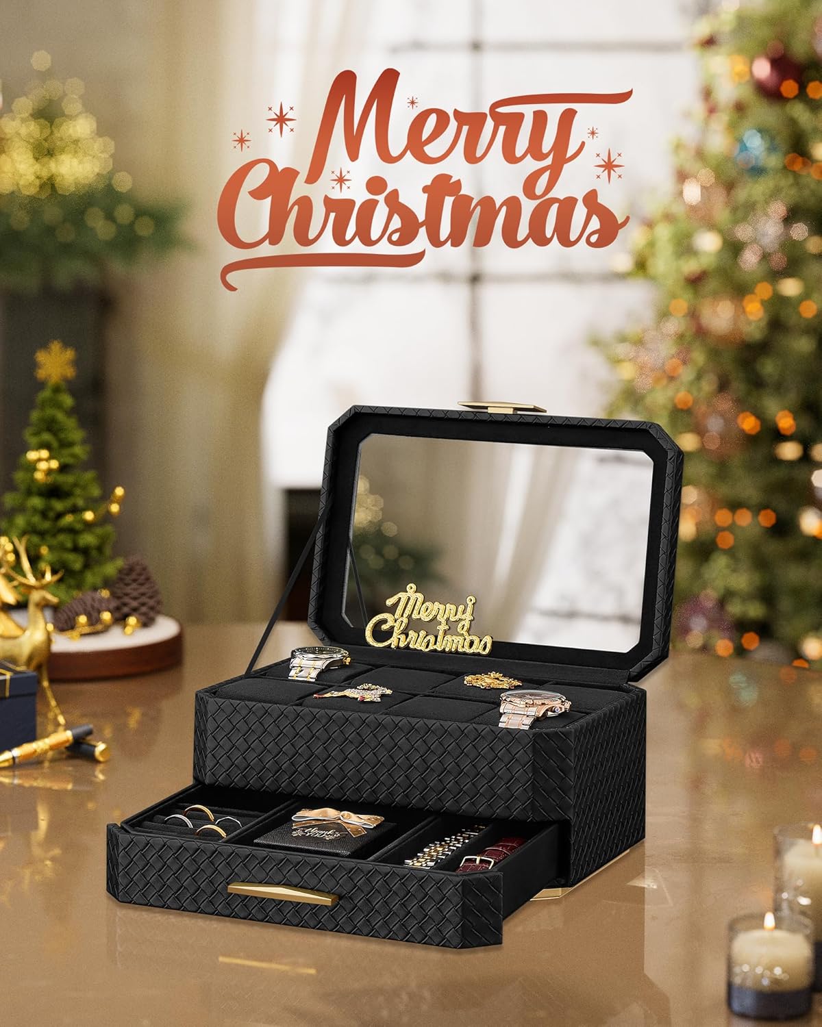 Klokke- og smykkeskrin med glasslokk – 8 rom, 2 nivåer, lås, PU-skinn blekksvart, reiseetui inkludert