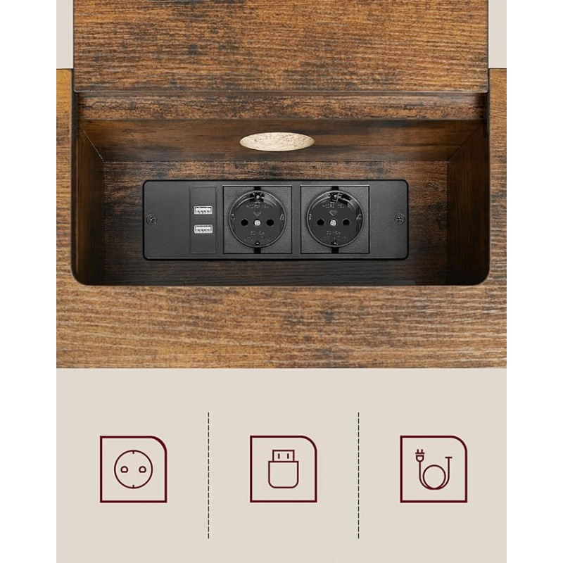 Stilrent industrielt design med robust stålramme og rustikk sponplate i vintage brun-svart look