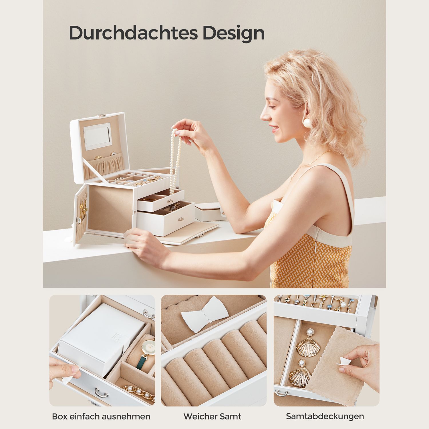 Smart oppbevaring med 2 skuffer, 2 sidedører for halskjeder og flere rom til ringer og små tilbehør, slik at du raskt finner det du vil ha på deg