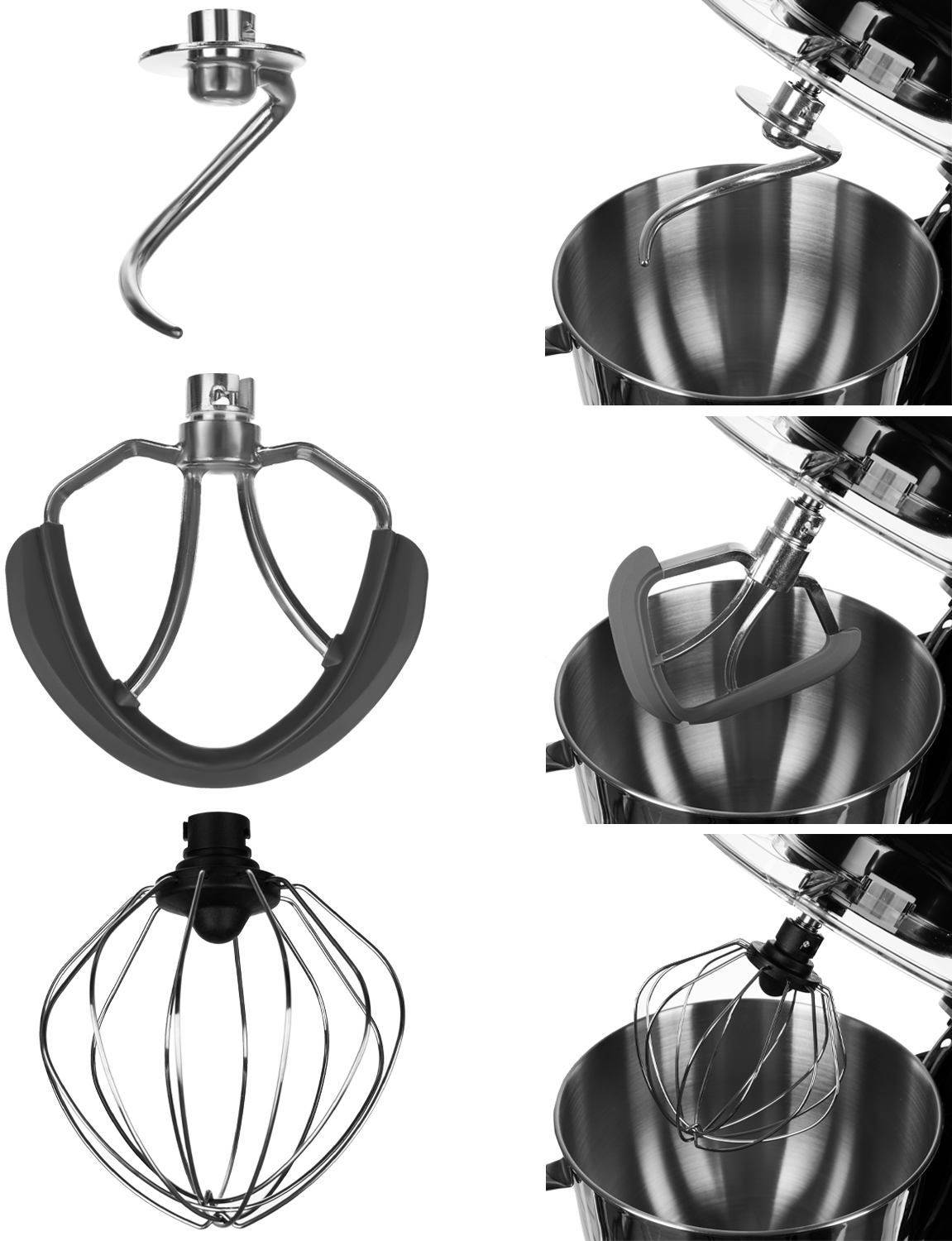 ✓ 3 profesjonelle tilbehør: fleksibel rører med silikon, deigkrok for tunge deiger og visp for luftige blandinger.