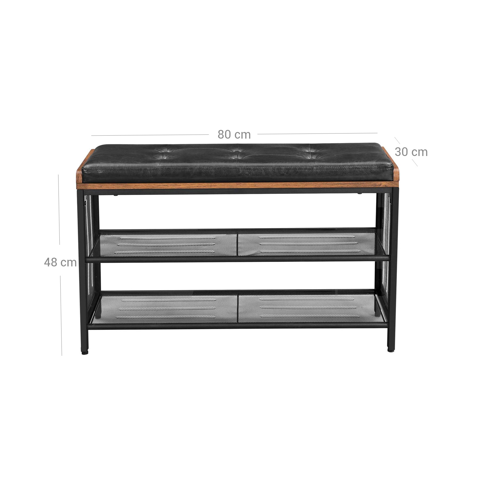 Skobenk i industriell stil med blankt svart kunstskinn og 2 tette netthyller i metall for skooppevaring