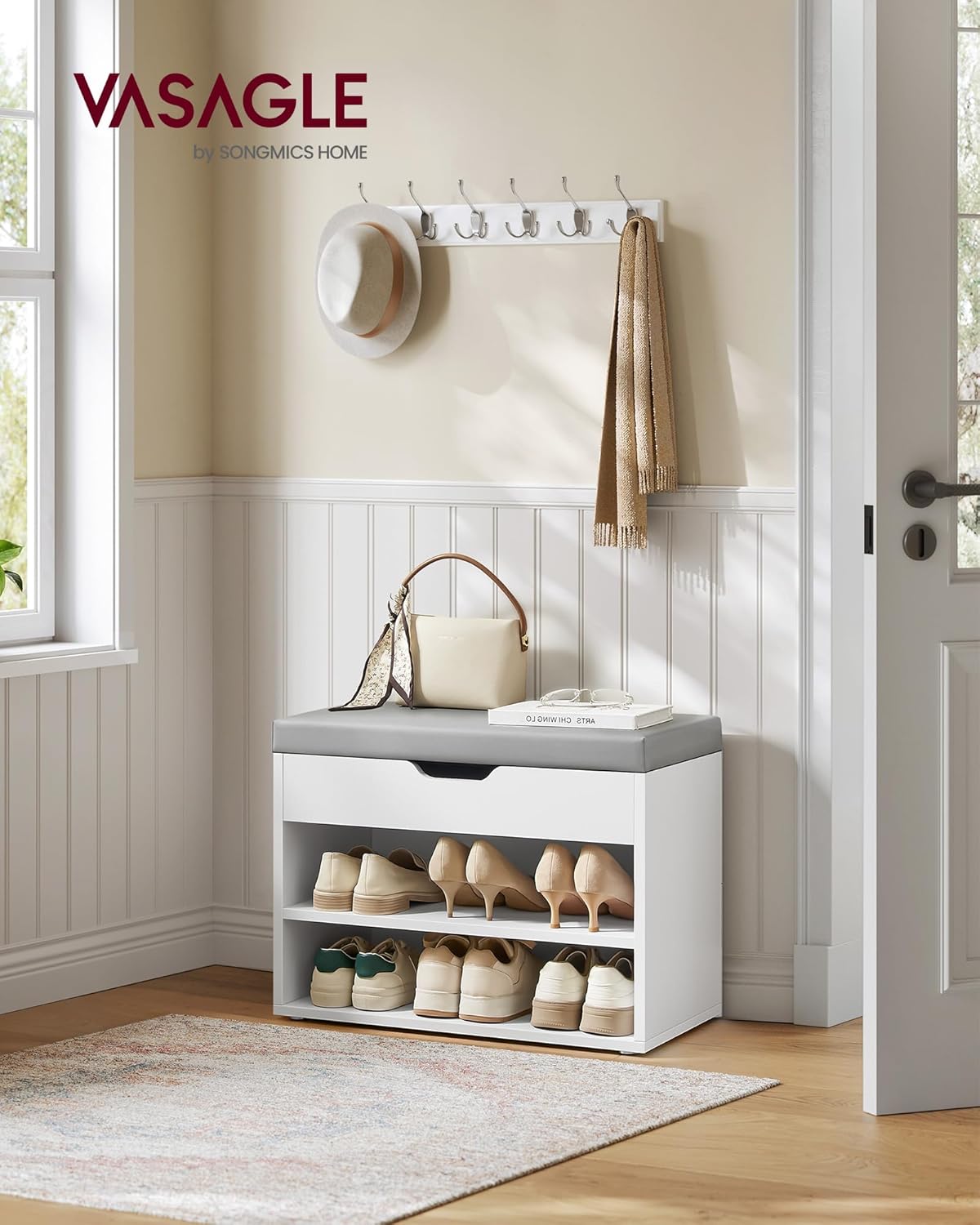 Multifunktionell skobänk som kombinerar bekväm sittplats med smart förvaring i en stilren, tidlös design.