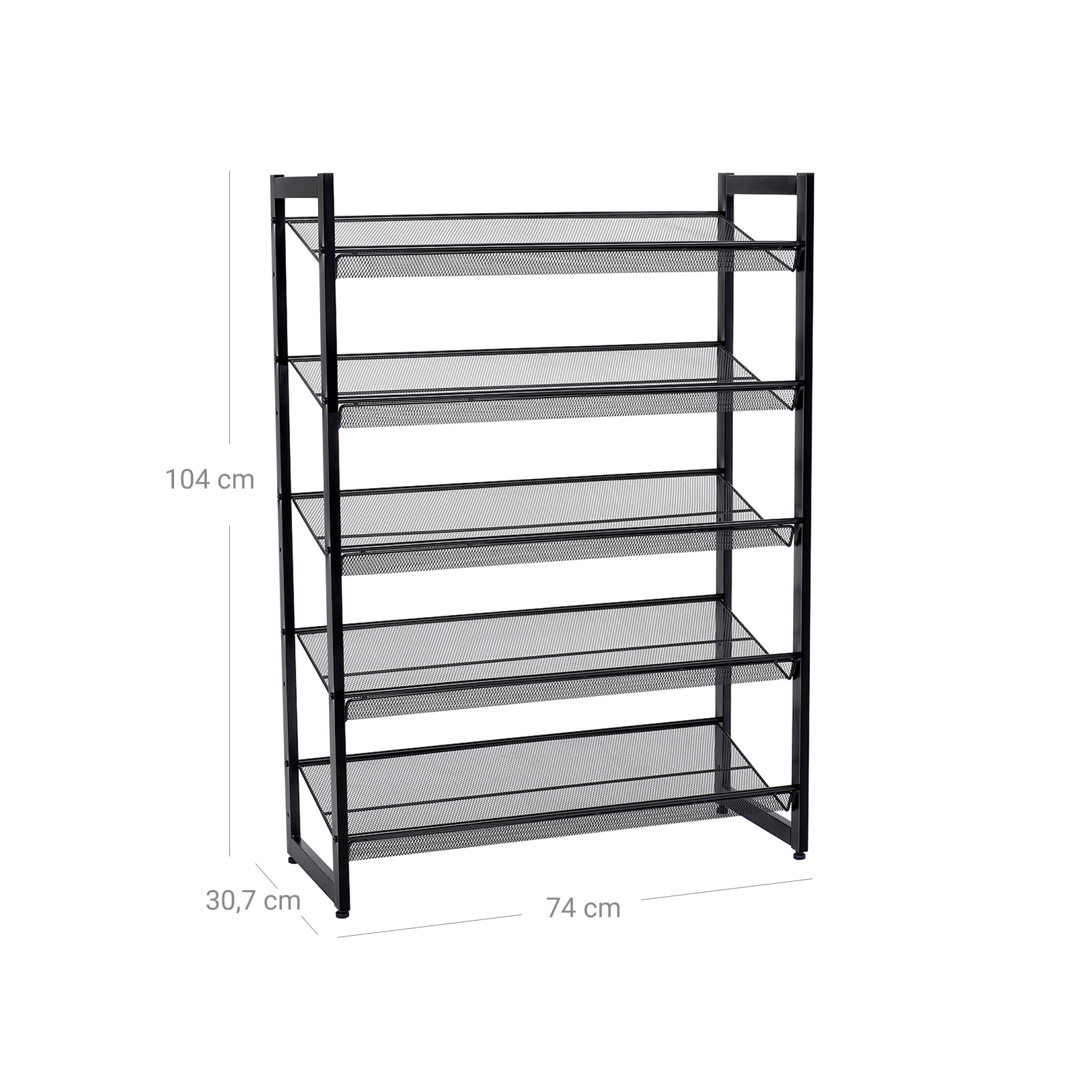 Stilren og elegant skohylle i svart med jernrør og metallnett som passer på soverom, i garderobe og gang