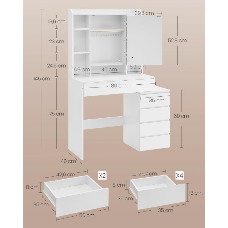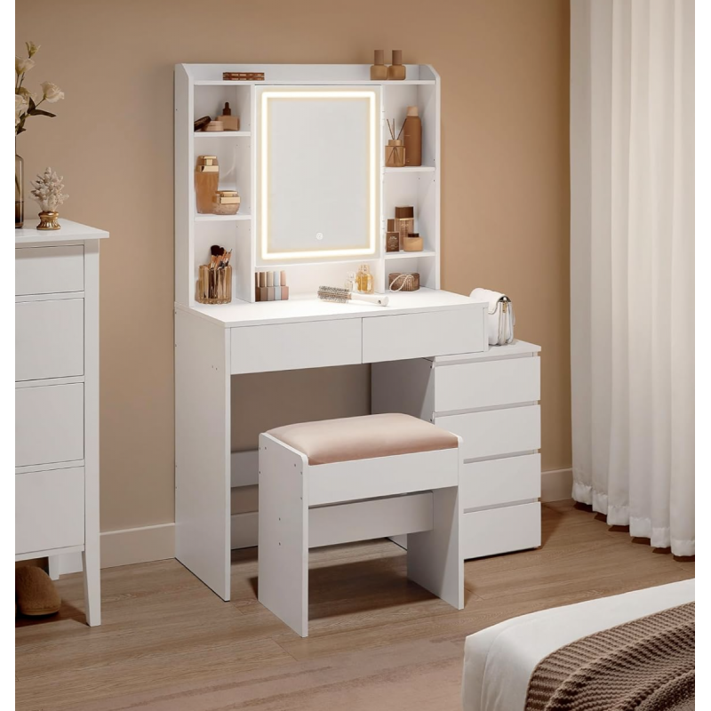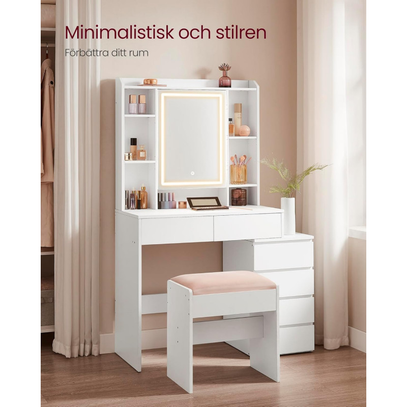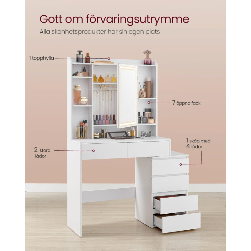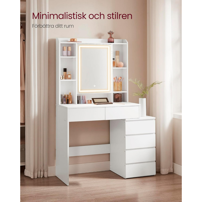 Sminkebord med LED-speil og justerbare hyller – hvit, 97,5 cm, med skuffer og skap