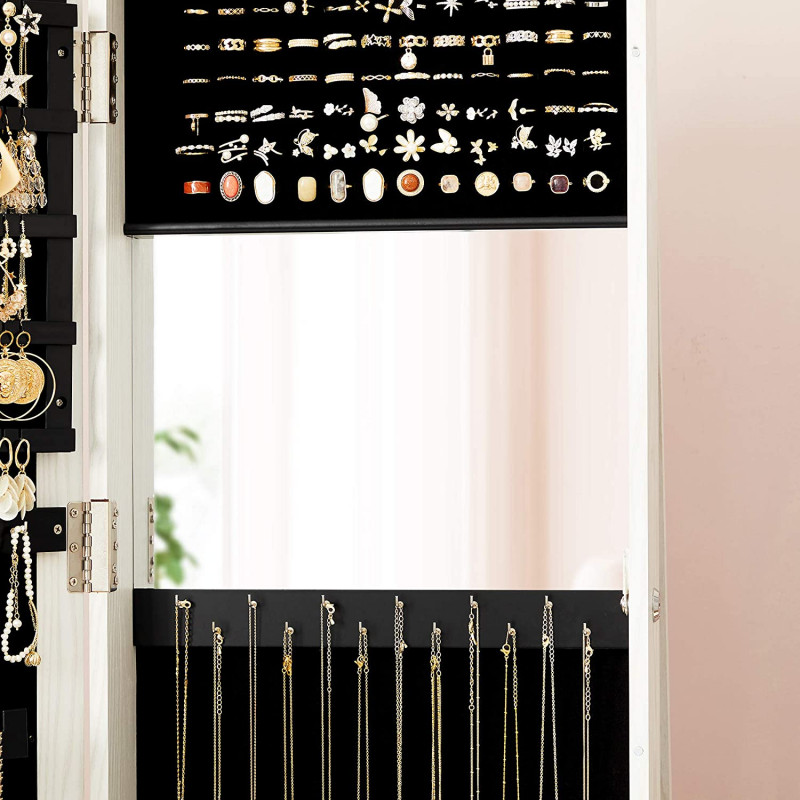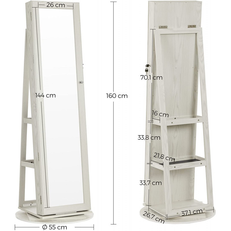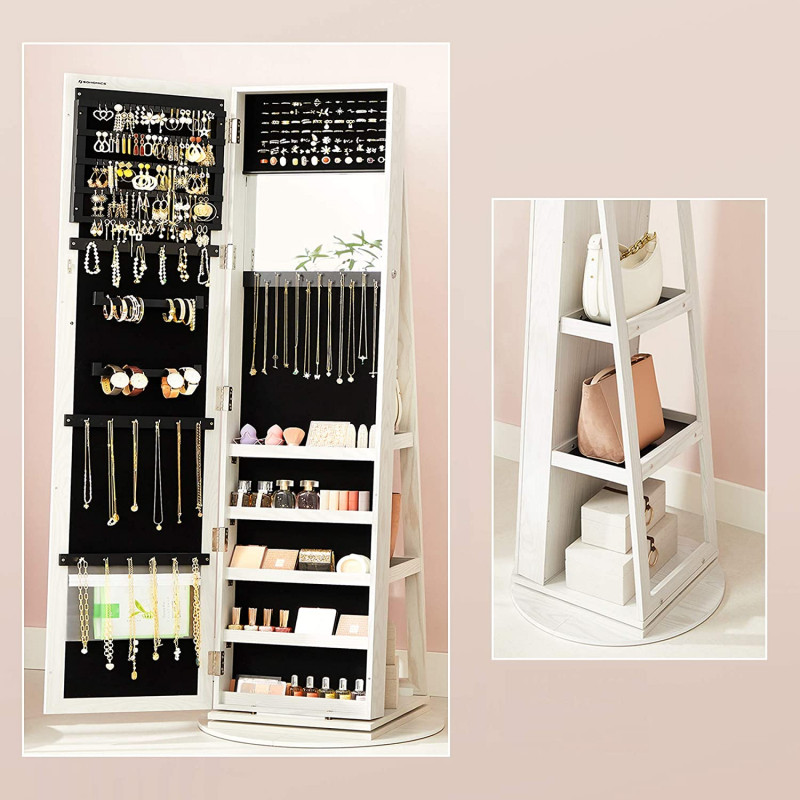 Speil med innebygd smykkeskap og sminkeoppbevaring – roterbar, hvit