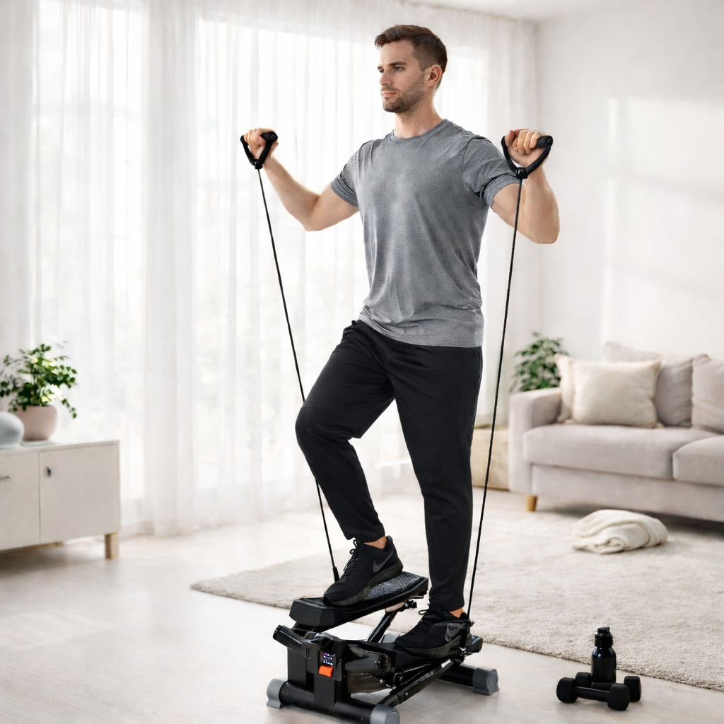 Twist Swing Ministepper med treningsbånd er en kompakt trappemaskin for effektiv hjemmetrening. Den vridende bevegelsen aktiverer flere muskelgrupper samtidig, mens LCD-display og justerbar motstand gjør treningen enkel å tilpasse etter ditt nivå.