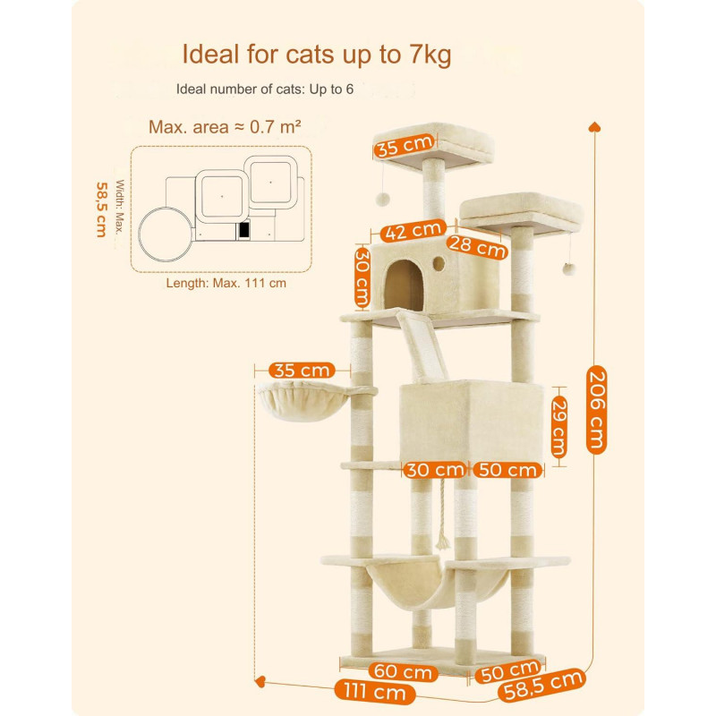 206 cm høyt kloretre med 5 nivåer og korte avstander (ca. 30–40 cm) som gjør det enkelt å klatre opp og ned – perfekt for katter som liker å sitte høyt