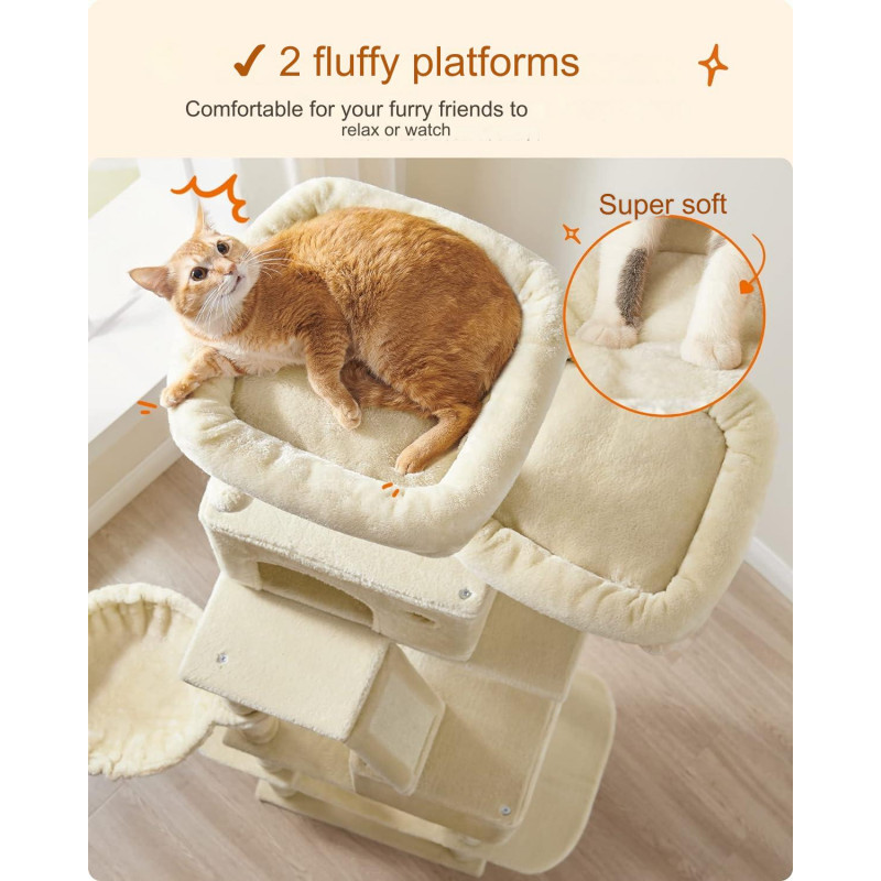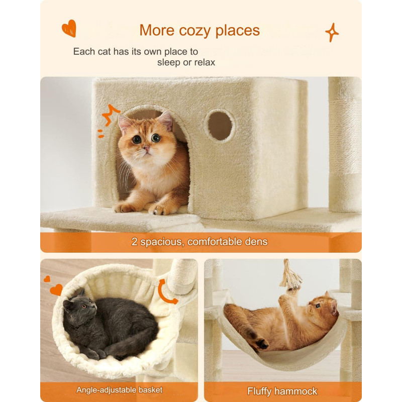 Alt-i-ett lekeplass for flere katter: 2 polstrede plattformer, 2 koselige huler, 1 fluffy kurv, 1 hengekøye og 2 plysjboller